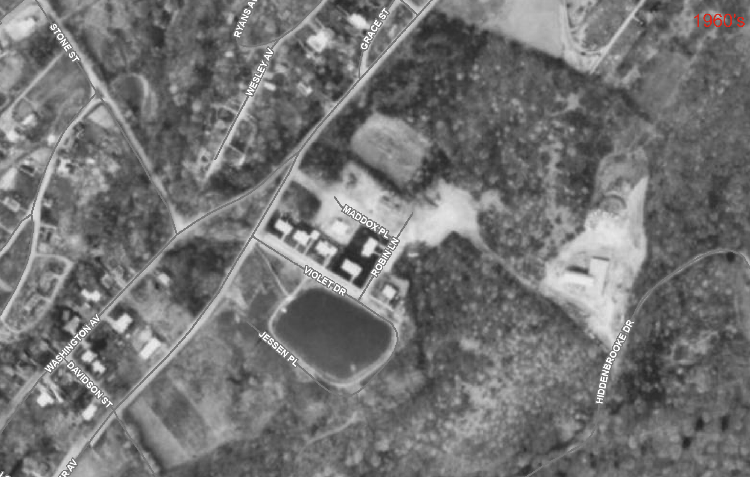 1960’s aerial imagery shows early residential development in the wetland and the beginning of the Carmelite Property development. The first of two new ponds is shown in the center of the image.