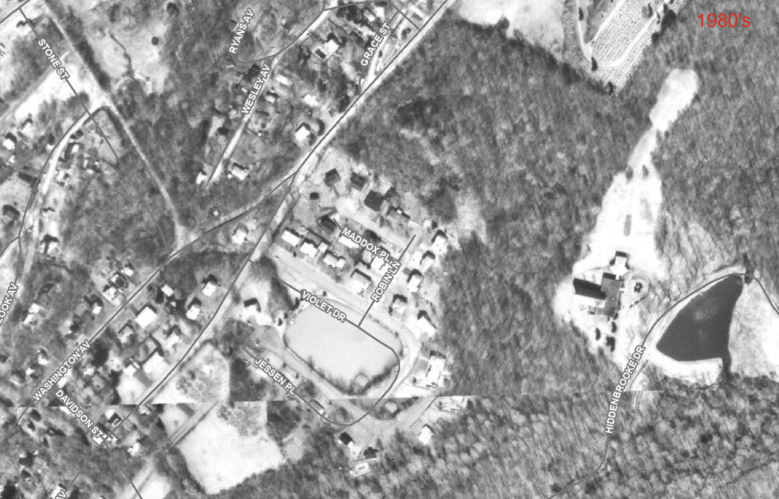 1980’s aerial imagery shows the residential development wetland infill and Carmelite property complete. Note the new pond on the right side of the image where there had previously been wetlands.