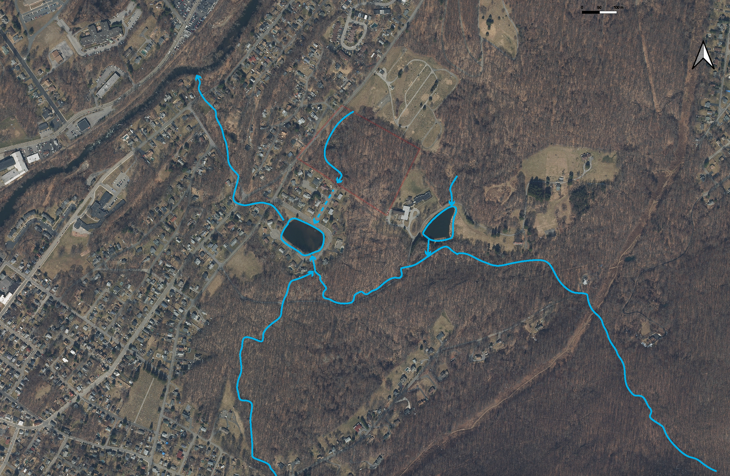 An illustration of the likely stream flow patterns in the lower Dry Brook watershed.